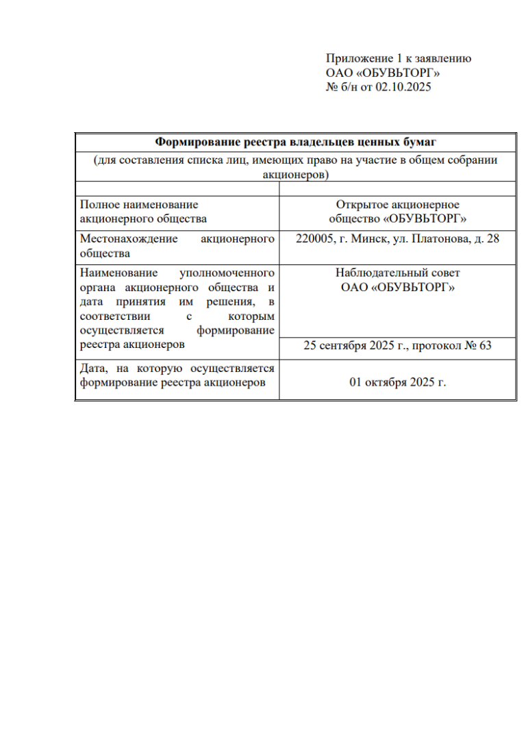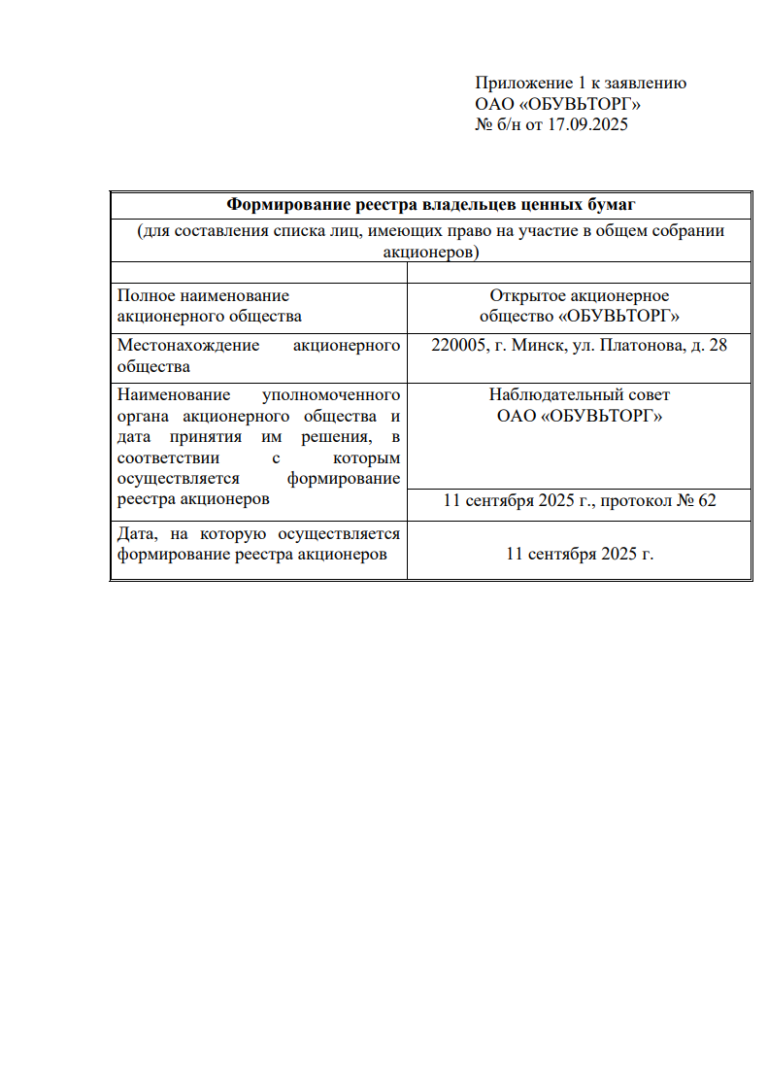 ОАО «ОБУВЬТОРГ» (далее – Общество) (местонахождение Общества: г. Минск, ул. Платонова, д. 28) настоящим уведомляет о том, что внеочередное общее собрание акционеров Общества состоится 15 октября 2025 г.